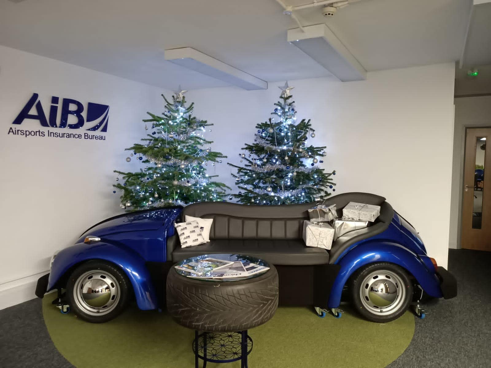 To mark the occasion, we commissioned what is possibly the coolest sofa in the insurance industry… designed and created by our friend Ian, aka ‘The Customizer’. It’s a VW Beetle, cut in half, sprayed in our distinct AIB blue and compliments the Range Rover tyre table beautifully.